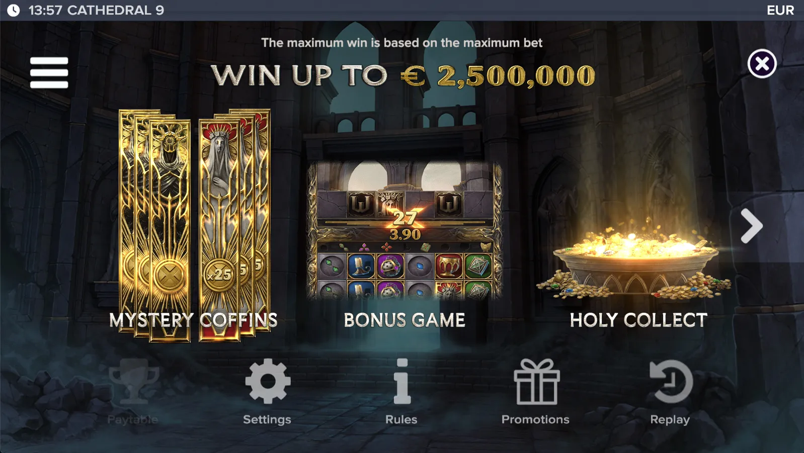Cathedral 9 offers a maximum win of 25,000x. This represents the highest possible payout you can achieve in a single spin or bonus round. The maximum win is typically reached through special features, bonus rounds, or multiplier mechanics. Keep in mind that hitting the maximum win is extremely rare and requires specific game conditions to be met.